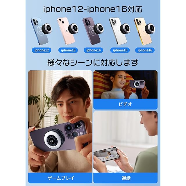 【磁気吸着式の冷却ファン 】熱を持ったスマートフォンを瞬間冷却するマグネット式のスマートフォンクーラーです。超強力マグネットを搭載しており、iPhone12シリーズ以上の型番には貼り付け用鉄板が要らず、直接スマホの裏面に吸着することができます。スマホ冷却ファンは360度の回転でき、給電ケーブルの向きが自由に動かせ、手操作を妨げないです。安定性も抜群です、緩みや落下の心配がなく、操作も簡単で片手で取り付けや取り外しが可能です。