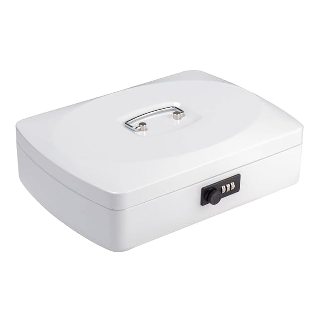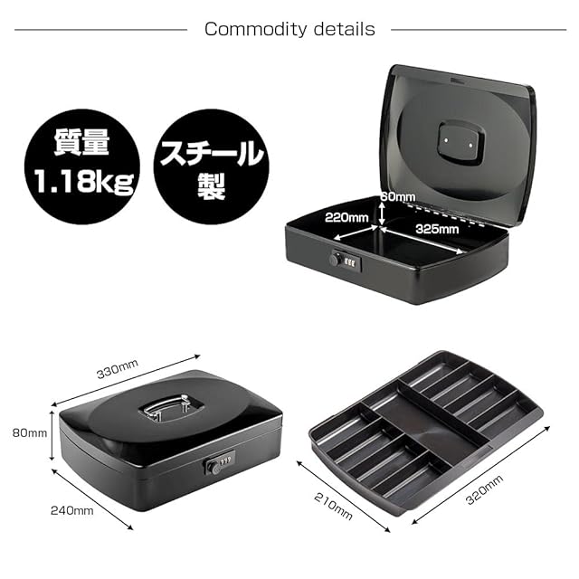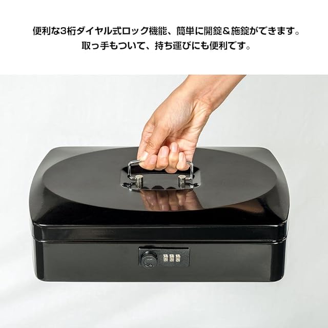 ●スチール収納ボックス。A4サイズ対応可。3桁ダイヤル式ロック。トレー付き。●小銭、お札以外にも、小物収納スペースが充実。●便利な3桁ダイヤル式ロック機能、簡単に解錠&施錠ができます。●ダイヤルロック付きセキュリティ・プライバシー対策もバッチリ!●取っ手もついて、持ち運びにも便利です。