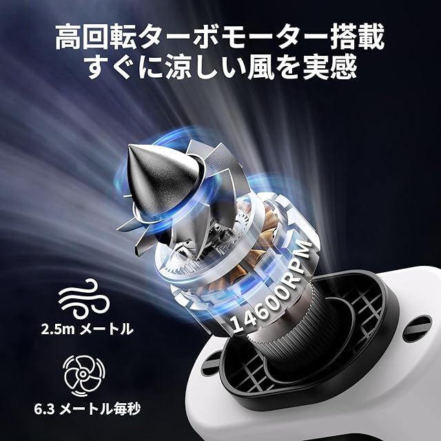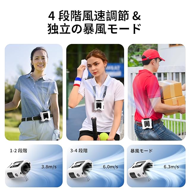 【4段階風速調節 + 1強力な暴風モード】腰掛け扇風機 が14600RPMの高性能モーターを搭載し、最大風速は6.3m/s,最大約2mの送風距離。4段階風量調節+暴風モード搭載,微風から強風まで風量の調整が可能です,瞬時に涼しく。屋外での活動や作業中でも、快適な涼しさを実感できます。