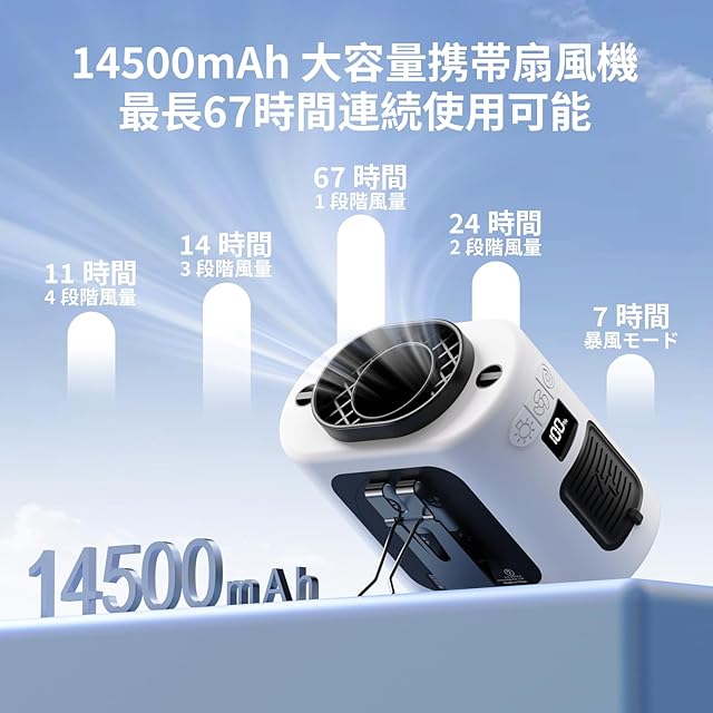 【長時間稼働】14500mAhの充電式バッテリーを搭載しており、この腰掛けファンは風速や照明モードに応じて最大67時間連続使用可能です。充電には6.5時間かかり、充電しながらの使用も可能です。風量と電池残量をリアルタイムで表示するLEDディスプレイが搭載されています。使用中に風量や電池残量を確認することができ、安心して使用できます。