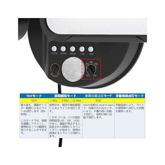 【4つの動作モードに対応】-TESTモード:このモードでは、感度を調整して理想的なトリガー範囲を見つけることができます。夜間運動感知モード:このモードでは、夜間に動作を検知した場合のみライトが点灯します。D2Dモード:このモードでは、黄昏時にライトが自動で点灯し、夜明け時に自動で消灯します。夜間常時点灯モード:手動設定で、ライトを夜間常に点灯させることができます。