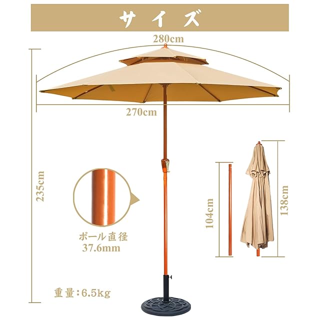 頑丈な鉄製ポール:8本傘の骨パラソルの直径は270cmの大き目のサイズ、頑丈な鉄製ポールを採用、水や錆びに強く、長く使えます。パラソルの支柱は2つに分かれるので、持ち運びもラクラク