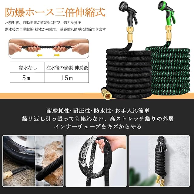 【三倍の伸縮ホース】伸縮ホースは、通水後に5mから15mまで引き伸ばすことができ、長さをすばやく3倍に増やすことができます。水圧に応じて伸縮幅も異なりますが、水を放すとホースはすぐに元の長さに縮むため、整理も非常に便利です。また、ノズルはリングで固定されているため、長時間押さえておく必要はなく、使用しやすく、水浸しや掃除の負担を軽減します。(注意:水圧によって、最大伸縮長さが異なる場合があります)