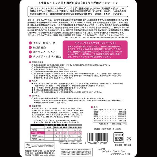 商品名:【まとめ買い 2袋】 三晃商会 F92 ラビット プラス メンテナンス 1.1kg × 2 PHeekオリジナルミニステッカー付