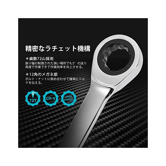 【使用便利】8mm~22mmの9サイズで多くのネジ作業に対応できて、番手が刻印され一見ですぐ分かります。レンチの片側が普通のメガネで本締めにも対応可能で、片側が72ギアラチェットレンチで早回しができて使い勝手がより良くなります。