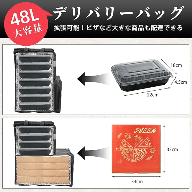 「大容量&拡張可能」拡張後48L大容量、高さ35cmx横幅40cmx奥行24cm(拡張時36cm)。デリバリーバッグの前に伸縮できる底がおり、ピザやお寿司皿とかビッグサイズな料理を収納できます。仕切りの板が1枚付き、上下にマジックテープで調節して使って、保温層と保冷層に分けられます;底板は下につけば、商品をこぼれにくいバランスを高められます。また、底板と仕切りの板が折れるでも元に戻れる、とても頑丈です!