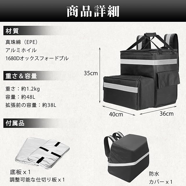 拡張可能大容量48lデリバリーバッグ、専用防水カバー付き雨の日も恐れない、仕切りの板付き上下二重にできます。