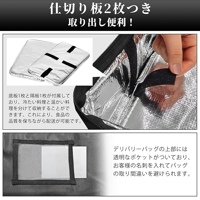 「防水カバー付き」当社のデリパリーバッグは専門な防水カバーをついている、別々に購入必要なしより経済的です!雨の日を恐れない、大事な商品をお客様へお届けします;バッグの底に収納ペースをついている、必要ない場合はいつでも収納できる、大変便利です!まだ防水カバーの表面は反射材を付き暗い夜道でも視認性高い、安全を保障できます。