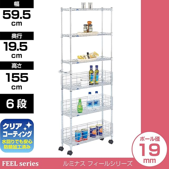 商品名:ドウシシャ ルミナス フィール キッチンラック ワゴン スチールラック 隙間収納 収納棚 幅20 6段 サビに強い 防錆加工 組立簡単 キャスター付き 耐荷重80kg (棚板1枚) ポール径19mm 幅19.5×奥行59.5×高さ155cm MD2015-6W