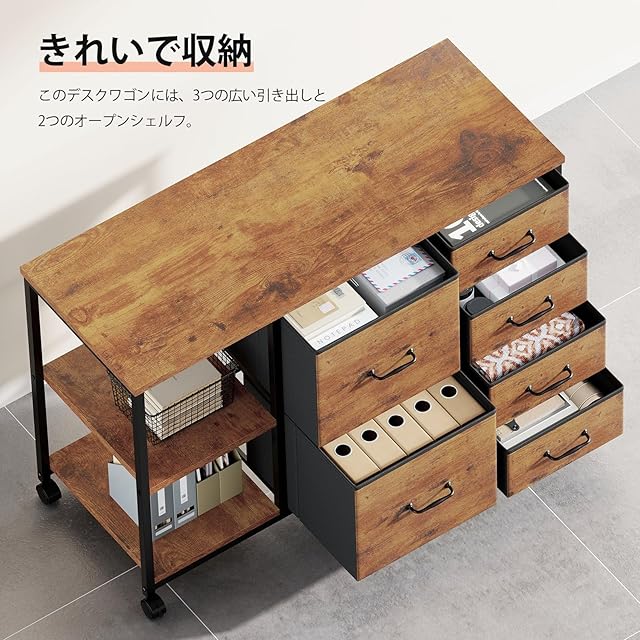 商品名:Maihail サイドキャビネット デスクワゴン 布製 袖机 層板付き サイドワゴン 6段 A4対応 プリンター台 大容量 キャスター付き デスク下収納 ビンテージ+ビンテージ