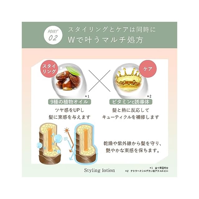✨【 スタイリング × ケア 】ダブルで叶うマルチ処方!乾燥や紫外線から髪を守り、艶やかな束感を保ちます。