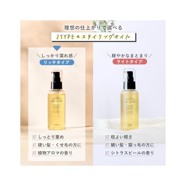 ✨【 しっとり 今っぽ濡れ髪へ 】重めの束感で、しっかりまとまりを作る「リッチタイプ」!ショートからロングまで、どの長さも自由自在♪<硬い髪・くせ毛の方へおススメ>✨【 スタイリング × ケア 】ダブルで叶うマルチ処方!乾燥や紫外線から髪を守り、艶やかな束感を保ちます。✨【 9種の植物オイル*配合 】ベタつかずにスッとなじむ自然派オイルが、ツヤ感をUPさせ髪に束感を与えます。 *全て保湿成分 ✨【 ビタミンC誘導体*配合 】髪と熱に反応してキューティクルを補修します。 *テトラヘキシルデカン酸アスコルビル✨【 髪にも肌にもやさしく 】オーガニックな成分*を配合し、「保湿&ツヤ&まとまり」を実現!スタイリング後、手に残ったオイルはボディケアとしても使用できます。 *オリーブ果皮油・アルガンオイル・シア脂 | もっとソフトにまとめたい「細い髪・猫っ毛」の方へは、ライトタイプ→B0CNX7B5L2もオススメしております。