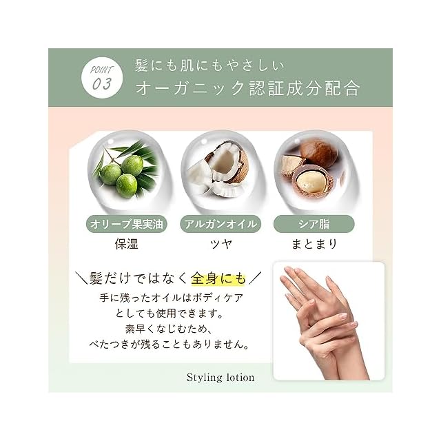 ✨【 髪にも肌にもやさしく 】オーガニックな成分*を配合し、「保湿&ツヤ&まとまり」を実現!スタイリング後、手に残ったオイルはボディケアとしても使用できます。 *オリーブ果皮油・アルガンオイル・シア脂 | もっとソフトにまとめたい「細い髪・猫っ毛」の方へは、ライトタイプ→B0CNX7B5L2もオススメしております。