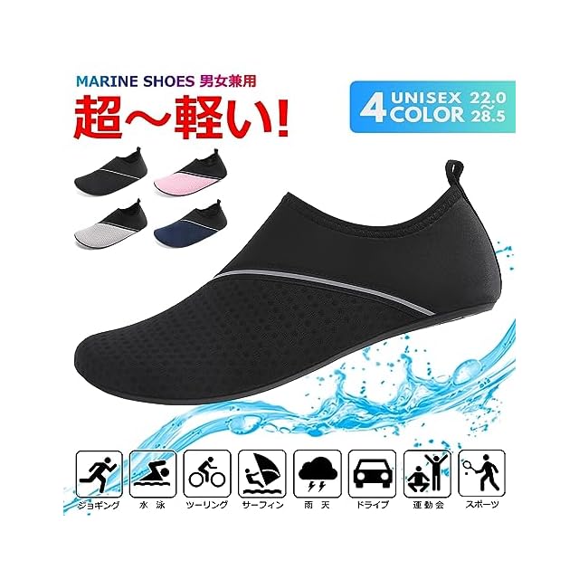 履き心地がいい:素足の感覚をそのままで! 超軽量マルチ機能性スキンシューズ。大人から子供までのサイズが揃えおるマリンシューズ。アッパーにはネオプレーンを採用することで、優れた伸縮性と排水性と通気性が期待できる。また、ソックスのような柔軟性で、履いても素足みたいな履き心地。弾力・伸縮性素材で足によくフィットし履き心地抜群。