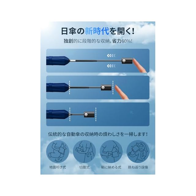 【業界初!進化型ワンタッチ自動開閉】新生チーム『日傘』が再び業界を震撼させる!UPEB独自の安全式段階収納自動おりたたみ傘は、反発を防ぎながら段階的に収納し、省力 60% となっており、小学 1 年生のお子様でも簡単に操作できます。伝統的な自動傘の収納時の面倒さ(地面に叩く方法、切腹式収納、鞘に入れる方式、跳ね返りによる誤傷など)を一掃します!」