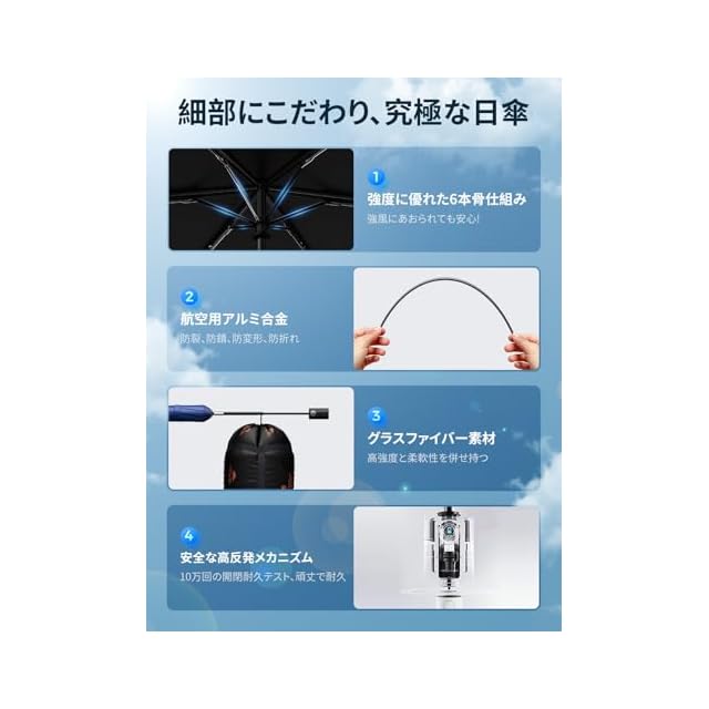 【耐久性が抜群・2年間の品質】UPEB軽量日傘は、三角形の力学構造、黄金比に近い設計、高品質で強化された素材を採用し、6級の強風に耐えることができます。コンパクトながらも、卓越した耐久性を備えており、安心して長期間ご使用いただけます。 UPEBは、長年、新技術・新製品を創造し続けています。そのために、研究開発に力を注ぎ続けています。常に業界トップクラスの品質を守り続けています。本製品は2年間の期間が付いています。万が一、商品に不具合が生じた場合には、弊社までご連絡いただければ、迅速かつ日本語で対応いたしますので、安心してご利用ください。