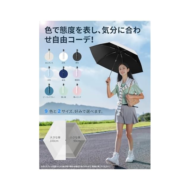 【大小2 種類のサイズ、傘下直径 90cm/100cm・9 色から選べます】90cm の小サイズは軽量で持ち運びが簡単で、いつでもどこでも風や雨を遮ってくれます。日常の通勤や買い物の際に、最適なお供となります。100cm の大サイズは、適切な遮蔽面積で、全方位の保護を提供します。突然の激しい雨でも、心配することはありません 。人それぞれユニークな個性とスタイルを持っています。UPEB が丹念にデザインした 9 色は、服との相性が良いだけでなく、それぞれ鮮明で特徴的です。傘を差して歩くすべての瞬間に、あなたが独一無二の風景になれます 。