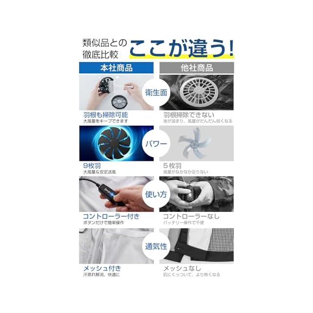 【強力送風・3段階風力調節】 空調作業服 は高性能ファン採用!9枚羽根&DCブラシレスモーター搭載で、強力かつムラの少ない風をお届けします。また、3段階風量調節でき、好みや体感によって切替できます。風量調節やファンの運転開始・停止を簡単に操作可能のコントローラー付いており、便利です 。ファンはカバー取り外せるデザインで、羽根の掃除ができいつも清潔におつかいいただけます。