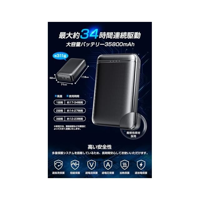 【大容量モバイルバッテリー付属・一日中使える】35800mAh大容量バッテリー付、最大34時間*連続稼働できます。バッテリーに出力電圧5VのUSBポート搭載で、 空調ベスト ファンに給電以外、スマホ、携帯扇風機、Bluetoothイヤホン等のUSB機器に充電できます。PSE認証済みで安心にお使いいただけます。(※ファン一個運転場合の最大使用時間です。※運転時間は着用条件・使用回数・充電回数などによって異なります。)