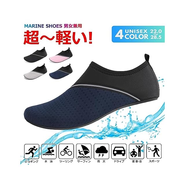 履き心地がいい:素足の感覚をそのままで! 超軽量マルチ機能性スキンシューズ。大人から子供までのサイズが揃えおるマリンシューズ。アッパーにはネオプレーンを採用することで、優れた伸縮性と排水性と通気性が期待できる。また、ソックスのような柔軟性で、履いても素足みたいな履き心地。弾力・伸縮性素材で足によくフィットし履き心地抜群。