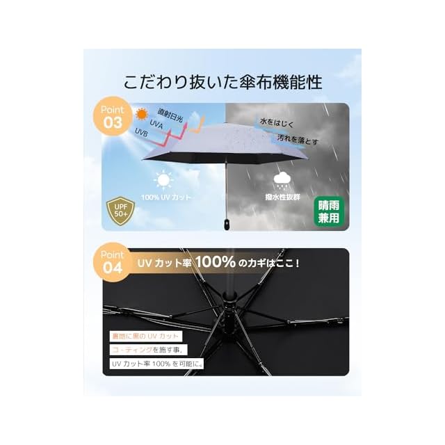 【晴雨兼用*耐風撥水】310T高密度の撥水加工材料で作られ、雨が珠のように丸くなり転がり落ちます。普通の傘より撥水性が優れ、軽く振るだけで雨水を振り払えます。長い間使用しても雨の染み込みが気にならなくなりました。電車内等の公共の場では人にご迷惑を掛けません。また防汚効果もあり、汚れにも強い生地です。中棒は頑丈航空機用アルミ合金製造、6本の傘骨にグラスファイバーと航空機用アルミ合金を使用しました。耐久性に優れています。強風で裏返っても元に戻ります。