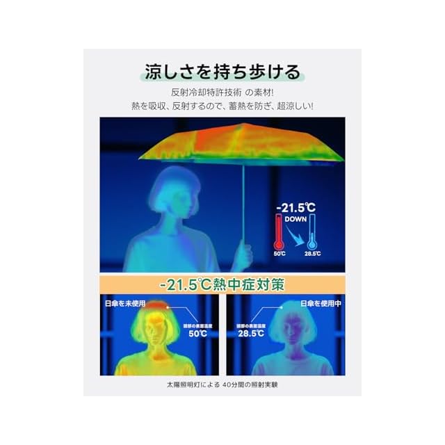 【UVカット*完全遮光】反射冷却素材を使用し、日傘を開いたら、傘下温度の上昇を大幅に抑え、最大-21.5℃、高密度の傘布と日焼け止めのブラックラバーコートを組み合わせた、優れた品質、優れたシェーディング効果、優れた断熱性。紫外線カット100%効果、UPF50+ 光透過率0、日差しの中で涼しく保ち、そしてあなたの肌を効果的に保護します。真夏の強い日差しを遮り、大切なお肌を太陽光線、紫外線からガードでき、日焼け対策アイテムとして猛暑を乗り切ります、UVカット率は100%以上。