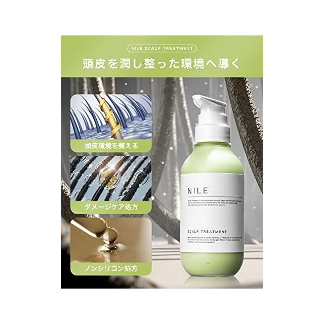 【頭皮へ直接塗りこみ活力頭皮へ導く】髪のダメージ補修を行うだけでなく、頭皮へ直接塗りこみ潤いを与えスカルプケアを行います。サラサラの髪へ仕上げるだけでなく、フワッと仕上がる髪へ導く頭皮用トリートメントです。 【頭皮に直接使用する頭皮用トリートメント】髪のダメージはもちろんのこと、頭皮に直接塗り込むことで頭皮を潤しスカルプケア成分を直接届けメンズの頭皮へアプローチします。 【頭皮に使用できるノンシリコン処方】ノンシリコン処方を採用しトリートメントを完成させることで、頭皮のことを考えたスカルプケア処方となっております。 【使用方法】NILEスカルフ゜シャンプーで頭皮を綺麗に洗浄した後、軽く水気をとり、2プッシュを目安に髪の長さ、毛量に合わせてトリートメントをご使用ください。髪に馴染ませるのはもちろん、頭皮にも使用していただけます。頭皮を動かしながら全体に馴染ませたら1分ほど放置し、ぬるま湯(36~38度)で洗い流してください。