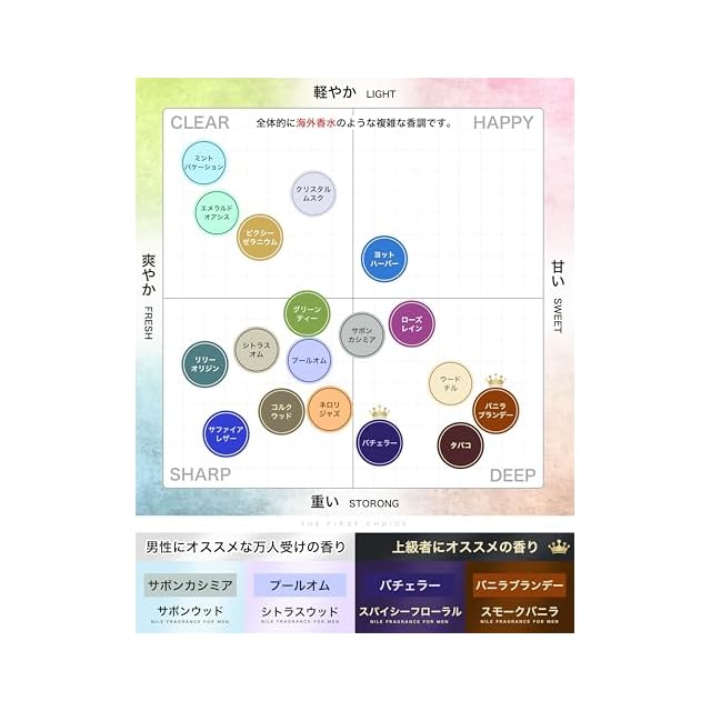 【高賦香率の芳醇なフレグランス】香りの織りなすハーモニーの余韻を味わってもらうため賦香率の濃度を高めました。1つ1つのオードトワレに秘められたストーリーをお楽しみ下さい。