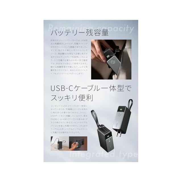 【ミニマルこだわったデザイン】Power Delivery 45Wのハイパワー性能を備えながら、手のひらサイズのコンパクト設計で、小さめのバッグやポーチにもすっきり収まります。外出時にバッテリー残量を気にしたり、ケーブルを探す手間も不要。カフェや出先でコンセントがあれば、デバイスと本体の両方を同時に充電可能。さらに、内蔵されたケーブルを取り出して接続するだけで、これ1台で簡単に使えます。や旅行の際にも便利です。