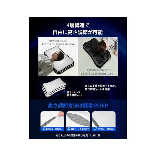 【まるでオーダーメイド級のフィット感!1.5cm単位で理想を追求 】4層構造のうち、下3層の調整シ-トを抜き差しするだけで、まくらの高さを1.5~10.5cmに調整できるようになっています。オーダーメイドの枕のように、きめ細やかな調整であなたにぴったり合う高さが きっと見つかります。高さがあるので横向き寝の方にもお勧めです。【洗えるから、いつでも清潔】毎日使う枕を清潔に保つことは、睡眠の質や健康に大きく関わりがあります。基本は風通しの良い場所で日光乾燥をさせて中の湿気を放出してあげるとよいでしょう。洗濯する際は薄めた洗剤でやさしく手押し洗いをおススメします。