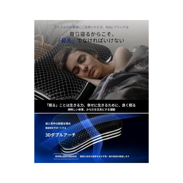【每日の気分や体調に合わせられる、万能タイプのまくら】仰向け、横向き姿勢でも気道を確保しやすいので、いびき対策に。Roky 枕、人間工学と頚椎の構造を考慮して、身体にフィットする流線型のデザインを採用。横向きで寝た時の身体の負担を少なくする構造で、自然な姿勢を保ちます。【お好みの高さに調節可能】姿勢よく自然に立った状態で測り、仰向き寝は首の一番深い部分から背中、横向き寝は首の一番深い部分から肩までの距離が、適した枕の高さの目安です。高さがあるので横向き寝の方にもお勧めです。
