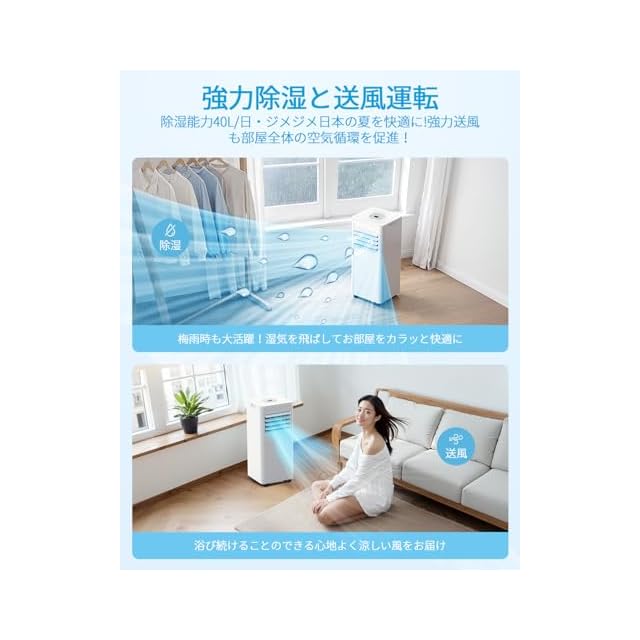 【梅雨も夏も、快適&スタイリッシュに】冷房・除湿・送風を自由に切り替え、あなたの暮らしをさらに快適に。✅毎年、湿気に悩まされる「梅雨」には、ぜひ除湿機能を活用してください! 最大40L/日の驚異的な除湿力で、ジメジメした空気も、部屋干しのストレスも一掃。除湿機顔負けのパワーで、快適で清潔な住環境を提供します。✅さらに、風を操る!Brehobo独自の革新テクノロジーを搭載。2段階の風力調整が可能で、ひとつは静かでやさしい風が快適な睡眠をサポートし、もうひとつはパワフルな強風で室内の換気や空気循環を効率的に行い、オールシーズン活躍します。