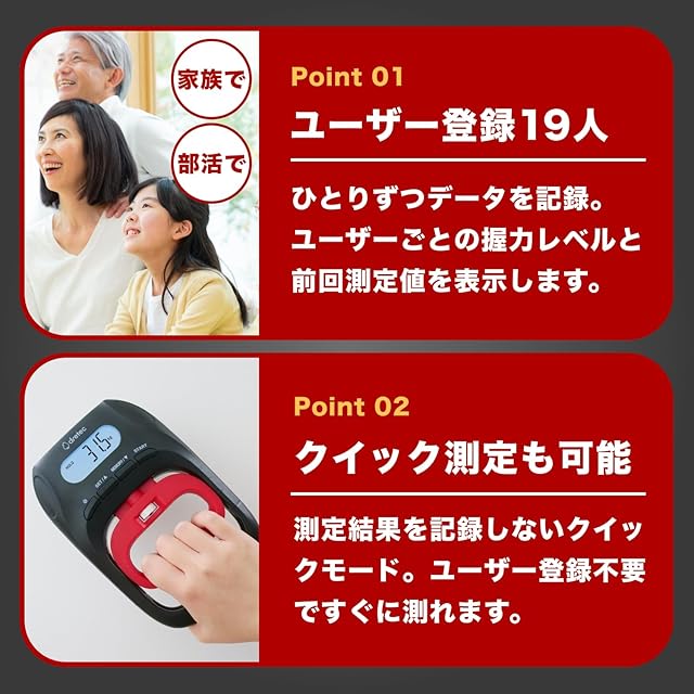 最大180kgまで測定可能なデジタル握力計 日本人の年齢別平均握力データを基に握力レベルを判定します 前回測定値メモリー機能付き ユーザー登録して測定を行うと前回値との差が表示されます 測定結果を記録しないクイック測定も可能 バックライト付の見やすい画面