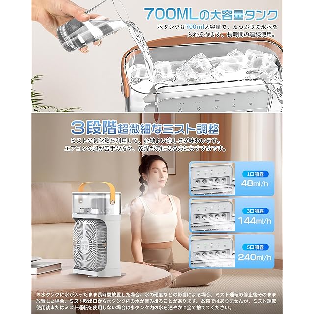 【便利なUSB-C給電式・700ML大容量タンク】卓上冷風機はUSB-Cケーブルで電源アダプターに接続するだけで簡単に給電式なので、パソコン/モバイルバッテリーからの給電に対応して、コンセントが近くにない場所でも使用できて、キャンプなどのアウトドアの際にも便利に使えます。水タンク容量は最大700mlであり、一度の給水で長時間使用できます、頻繁に水を追加する必要ないです。上部から簡単に水を注ぐことができるデザインで、水を補充する際のストレスがありません。透明な水位窓で、一目で水の残量を知ることができます。これにより、適切なタイミングでの給水が可能になります。ミストモードで水不足になると自動的に加湿が停止し。