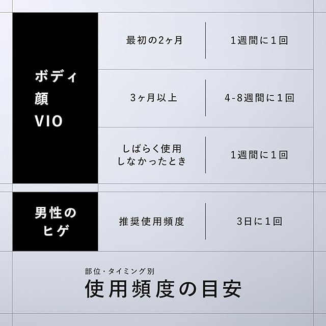 【使用頻度の目安】 ボディ・顔・VIO 最初の2ヶ月:1週間に1回 3ヶ月以上:4-8週間に1回 しばらく使用しなかったとき:1週間1回 男性のヒゲ 推奨使用頻度:3日に1回