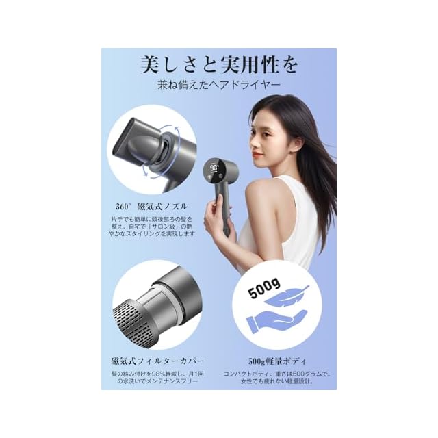 商品名:ドライヤー 超大風量 速乾【2025新設計・3億高濃度マイナスイオン】 ヘアドライヤー ブラシレスDCモーター 美髪 ヘアケア 美容師監修 12通りの風をカスタマイズ可 NTC温度制御システム 過熱防止 軽量コンパクト 持ち運び便利 静電気除去 タッチスクリーン 省エネ ヘアサロン/家庭用/旅行用 PSE認証済み ホルダー/マグネット式ノズル付き 日本語説明書付き