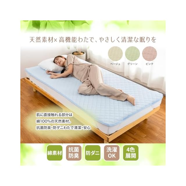 こちらの綿100%の敷きパッド(セミダブル)は、肌に優しい天然素材を使用し、菌の増殖を抑える機能・防臭・防ダニ機能を備えた中綿「帝人マイティトップ」を採用。通年快適に使えるオールシーズン仕様で、S〜Dサイズ・4色展開と選択肢も豊富。洗濯機対応でお手入れも簡単。ベッド用敷きパッドとして清潔で心地よい睡眠環境をサポートします。 [ Sサイズ:100×200cm, SDサイズ:120×200cm, Dサイズ:140×200cm ]
