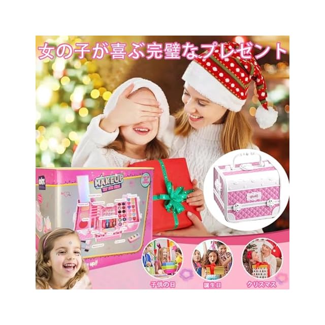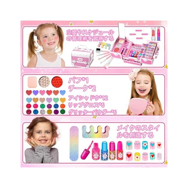 1. プロ級のリアルさ! 安全設計の本格メイクセット<br> キッズ用安心素材:全てのパーツはCPC基準をクリア(角丸加工・無毒塗料)<br> 本物そっくりデザイン:ミラー付きコンパクト・カラフルアイシャドウパレット(12色)・ふわふわパフ付き → 「ママみたいにメイクできる!」という女の子の憧れを安全に実現<br> 2. 知育要素が詰まった遊びの工夫<br> 色の組み合わせ学習:混色可能なチークで色彩感覚を養う<br> 整理整頓習慣:パーツ収納ケース付きで「使ったら片付ける」が自然に身につく<br> コミュニケーション促進:保護者と一緒に「おしゃれ相談ごっこ」が可能<br> → 遊びながら社会性・想像力を育む「プレイフルラーニング」設計<br> 3. 贈り物に最適なプレミアム仕様<br> 長く愛せる品質:ABS樹脂製で落下衝撃に強い<br> 衛生的お手入れ:水洗い可能パーツ(鏡・パフ除く) → 誕生日・入園祝いなどの記念日に喜ばれる"ずっと残る贈り物"<br>