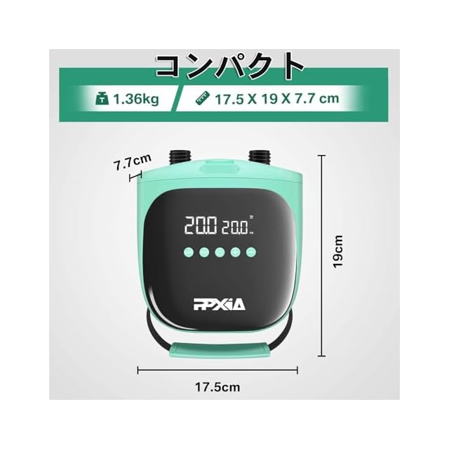 この高性能電動エアーポンプは、パドルボードやインフレータブルボートなどのアウトドア用品に最適です。最大20PSIの強力な空気圧で、第1ステージでは250L/分、第2ステージでは70L/分の効率的な空気の出し入れが可能です。高解像度デジタルディスプレイを搭載し、目標圧力値を設定すると自動停止する便利な機能付き。7種類の互換性のあるノズルが付属し、様々なインフレータブル製品に対応します。12V車用シガレットソケットとType-C対応で、使用時の電源確保も安心。本体は1.36kgと軽量で、コンパクトサイズ(19×17.5×7.6cm)ながら持ち運びに便利なハンドル付き。パドルボード、カヤック、テント、プールフロート、浮き輪など、アウトドアレジャーに幅広く活用できる実用的なアイテムです。使いやすい操作性と、迅速な空気の注入・排出機能で、アウトドアアクティビティをより快適にサポートします。