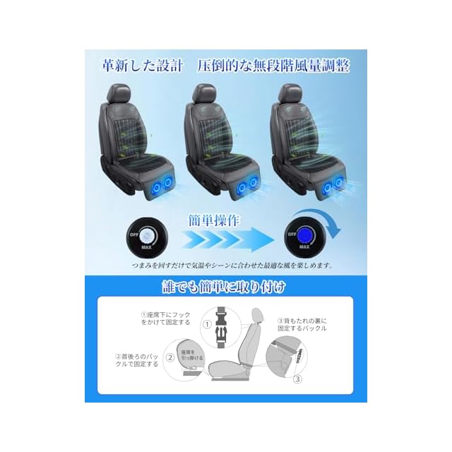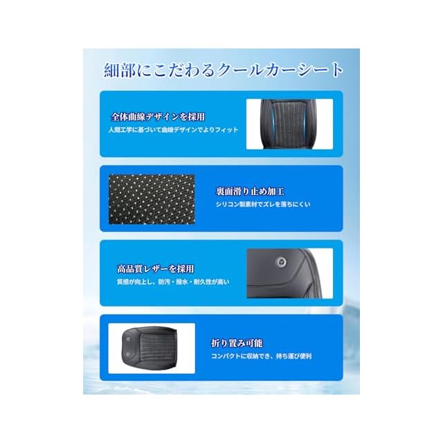 【細部にこだわったクールカーシート】1.シートクーラーの裏面には滑り止めのシリコン製素材を採用しているので、 カーシートクーラーが運転席などから落ちる心配しない。2、高品質レザーを採用し、防汚·撥水·高耐久性を確保しつつ、洗練された仕上げで自動車の内装とも完璧に調和できる。3、人間工学に基づいて曲線デザインでベンチレーションシートをよりフィットにする。4、DC12V/24V車対応でき、軽自動車、SUV、大型トラックなど幅広い車種に対応可能!