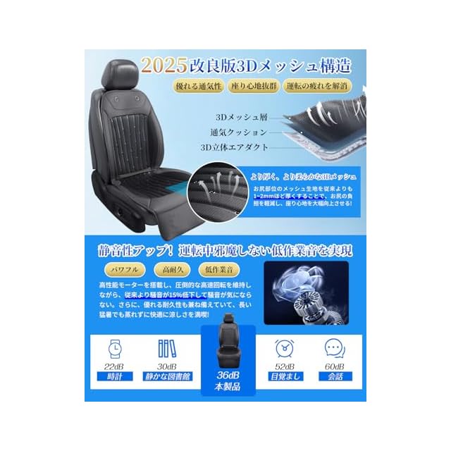 【通気性UP !座り心地UP!3Dメッシュ構造】クールシート座面の快適性を向上させ、長距離運転の要望に応えるため、お尻部位のメッシュ生地を従来より1~2mmほど厚くなり、お尻の負担を軽減し、座り心地を大幅向上させ、一般的なクッションの座り心地を実現する!また、多層の3Dメッシュ素材を設計で、優れた復元力と座り心地を確保しつつ、通気も強化され、長時間座っていても蒸れないようになっている。