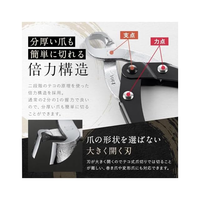 【◆従来の半分の力での切れ味を実現】切る際の負担を軽減する為、クリッパー式を採用しております。2段階のテコの原理で刃先に掛かる圧力を増力し切断します。同サイズの爪切り器と比較し半分以下の握力で爪の切断が可能となりました。柄は、柔らかく滑りにくいソフトビニールキャップを施したことによって持ち手が滑るのを防ぎます。また刃形状を斜めにしており、爪切断時の視認性がとてもよく、足の爪も楽に切れます。刃先端が鋭利ですので爪の端部分に食い込みがとてもよく、巻き爪や厚爪・変形して切り難しくなった爪も楽々切断出来ます。