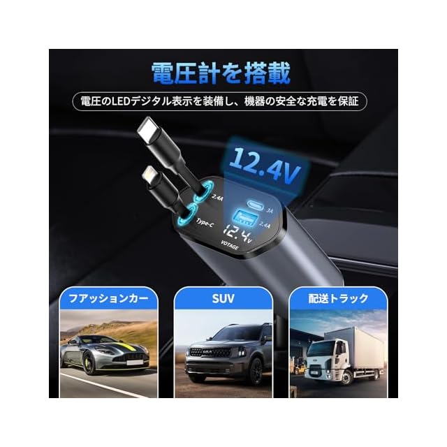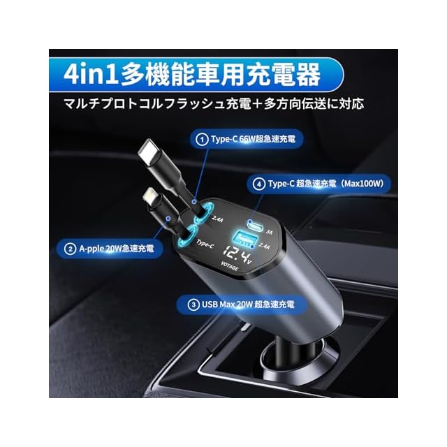 商品名:車 充電器 シガーソケット USB【巻き取り式】カーチャージャー 4in1 車載充電器 巻き取り式ケーブル Type-C100W/20W急速充電 4台同時充 電 iPhone16/15/14/13/12 Galaxy S22/S21 UItra Xperia iPad AQUOSなど LED表示電圧 DC12-24V車対応