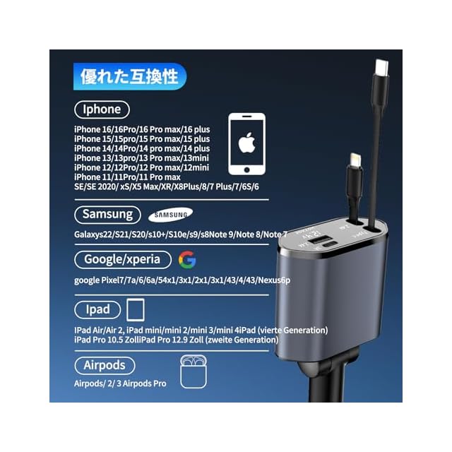 【4 IN 1車 充電器】2025新版 車 充電器は、シガーソケット 2 USBポート+2 巻取り式ケーブル、最大4台のデバイスを同時に急速充電することができます。 ご家族やお友達と一緒にドライブするとき、すべてのデバイスを同時に充電することができ、バッテリー切れによる不便を心配する必要はありません。 自動運転、家族での外出、キャンプ、旅行など様々なシーンに適しています。
