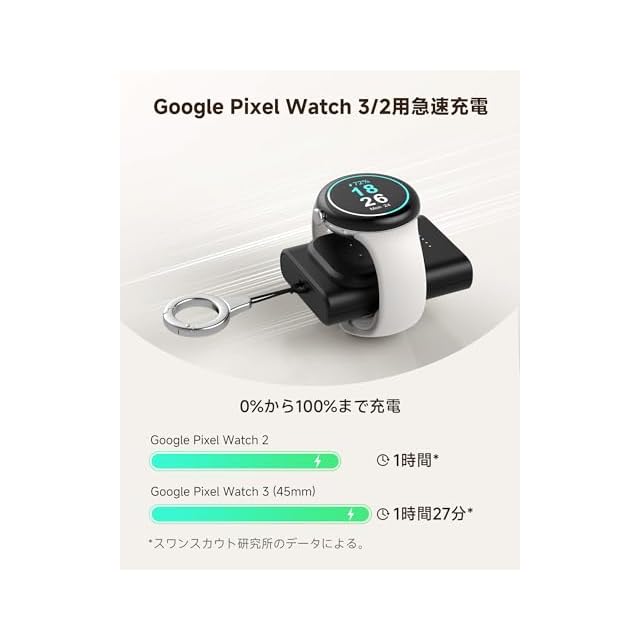 【Pixel Watch専用 充電器】1800mAh モバイルバッテリ、Pixel Watch 3/2 & Fitbit Versa 4/Versa 3/Sense 2/Sense/Ace LTE対応(Pixel Watch 1非対応)、ピクセルウォッチ 充電器、小型軽量設計 キーホルダー付き、SwanScout 305G2