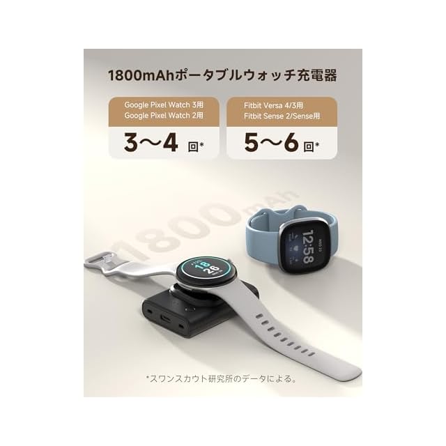 【大容量1800mAh】Pixel Watch 3/2を3〜4回、Fitbit Versa 4/3やSense 2/Senseを5〜6回フル充電可能。外出先でも安心のPixel Watch 充電器です。