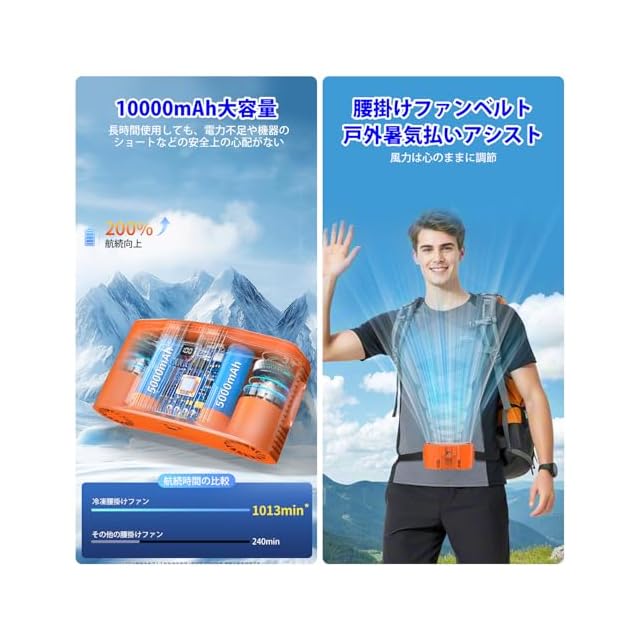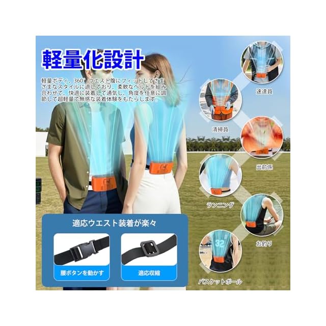 【特別な腰掛けフック】独自の集風式ダクト設計により、10m/sの高速気流を実現し、広範囲にわたり素早く涼しさをお届けいたします。軽量ウエストベルト設計で登山やアウトドアにも最適、風量調節可能で360°フィットする薄型ボディは、あらゆる体型に快適な装着感を提供いたします