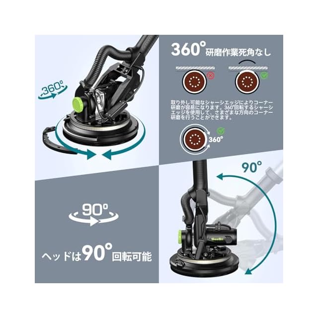【研磨作業360°死角なし】取り外し可能なエッジデザインにより、電気ドライウォールサンダーが隅々まで容易に研磨可能です。壁際などの狭い場所でも効率的に研磨できます。さらに、ヘッドは90度回転可能で、研磨角度の調整が便利です。傾斜のある天井や凹凸の表面でも楽に平らに研磨できます。
