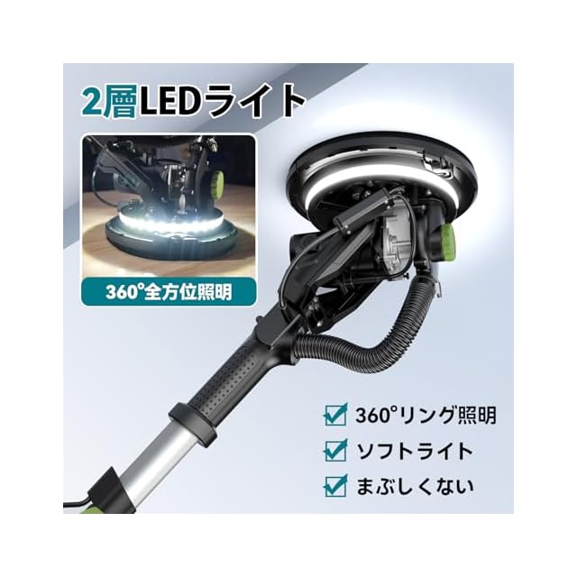 【二重LEDライト】ポールサンダーは二重LEDライトを搭載しており、360度の照明を実現します。夜間や暗い環境でも正確な研磨が可能です。柔らかい光で、作業面の状況を明確に確認可能と同時に、目にまぶしさを感じません。