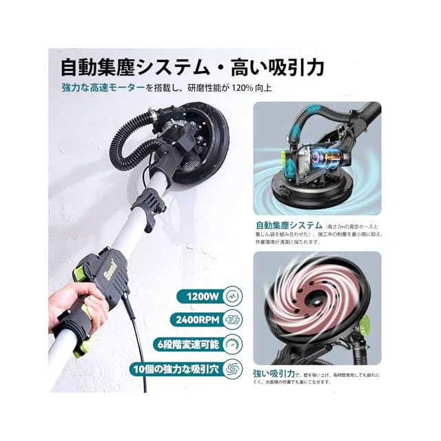 商品名:【2025最新改良】SEESII 電気ドライウォールサンダー 1200W ポールサンダー 伸縮式ポール 210cm調節可能 6段変速 2400 RPM LEDライト付き 自動集塵システム ロングダストホース 集塵袋 6枚のサンドペーパー 2枚の無塵サンドペーパー 天井や壁面の作業に最適